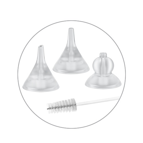 3 Měkké silikonové nástavce Ultra měkké 3 silikonové nástavce, které lze přizpůsobit typu sekretů a věku děťátka. Obsahuje také přídavný čistící kartáček. Zaručeně hygienické a přizpůsobené potřebám těch nejmenších.