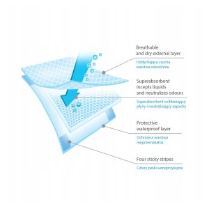 Jednorázové přebalovací podložky jsou velkou pomocí při přebalování dítěte. Mohou se také použít pro maminky jako podložky v poporodním období. Mimořádné absorpční vlastnosti pomáhají zajistit komfort a hygienu. Vnější plastové obložení chrání před znečištěním, zatímco samolepící pásky udržují polštářky na svém místě. Superabsorpční materiál uvnitř podložky váže vlhkost rychle, neutralizuje jakékoli nepříjemné pachy.