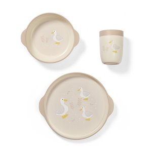 Jídelní souprava pro děti – talíř, miska a sklenička pro samostatné jídlo. Naše dětská jídelní souprava obsahuje vše, co potřebujete k tomu, aby vaše dítě mohlo začít s prvními pokusy o samostatné jídlo. Souprava obsahuje talíř, misku a skleničku, ideální pro podávání teplých i studených pokrmů, a také pro učení se pít z otevřené sklenice. Odborníci tvrdí, že tento způsob pití přispívá ik rozvoji řeči a zlepšuje koordinaci rukou a očí, posiluje svaly obličeje a úst a omezuje kontakt nápojů se zuby, čímž pomáhá předcházet zubnímu kazu. Souprava roste spolu s vaším dítětem - je praktická, bezpečná a podporuje rozvoj zdravých návyků. Jsou snadno uchopitelné i pro malé dětské ručičky.