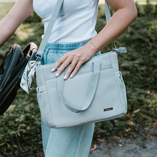 Můžete ji jednoduše připevnit na kočárek, nosit na rameni nebo držet v ruce – dle vlastního uvážení. Stylový šátek tašku krásně ozdobí. Vše, co musíte udělat, je rozhodnout se, kam šátek uvázat.