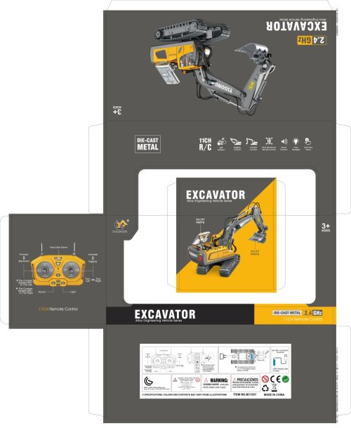 Maximální rychlost 3 km/h Frekvence 2,4 GHz pro plynulé ovládání Dosah dálkového ovládání až 20–30 m Maximální radiofrekvenční výkon 100 mW Funkce One click demo pro předváděcí mód, zvukové a světelné efekty Otáčení konzole o 680° doleva i doprava Funkce „Uninstall” pro zvednutí ramene, „Digging” pro bagrování Díky těmto realistickým funkcím je tento RC bagr skvělý pro všechny, kdo mají rádi modely s vysokou mírou detailu a interaktivity.
