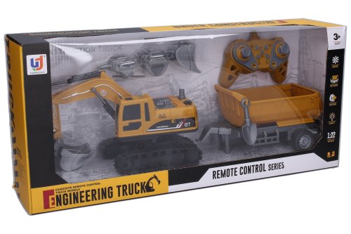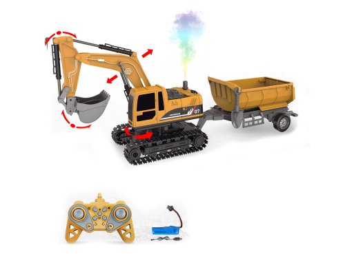 Bagr 4v1 s vlečkou RC na dálkové ovládání. Velikost 45 cm, bagr 24 cm. Součástí kovová koncovka bagr, plastové koncovky; bagr, nakladač dřevin, bourací kladivo. Frekvence 2.4GHz. Světelné, zvukové a dýmící efekty. Bateriový pack 3.7V 500mAh Li-ion do bagru součástí, 2xAA do ovladače nejsou součástí. Nabíjecí USB kabel součástí. Nádobka na vodu součástí. Nádržka na vodu v zadní části bagru. Přepínač ON/OFF ze spodní straně otočné věže. Ovladač - levá páčka - pohyb vpřed a vzad, pravá páčka - otáčení vlevo a vpravo, tlačítko demo, tlačítko aktivace zvukových efektů, tlačítko dýmící efekty, tlačítko otáčení věže vlevo, tlačítko otáčení věže vpravo, tlačítko pokládání ramene, tlačítko zvedání ramene.