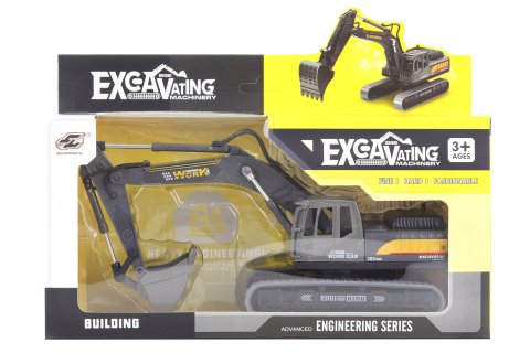 Model kovovoplastového bagru o rozměru cca 20,5 x 9,5 x 6,5 cm. Rozměr balení cca 18,5 x 24 x 7 cm. Věk 3+