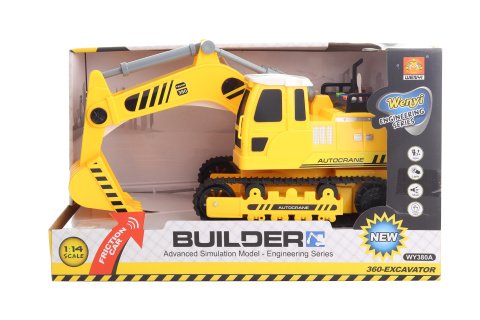 Stavební bagr na baterie (jsou součástí balení). Bagr po stisknutí tlačítek svítí a vydává zvuky. Má pohyblivé hrablo. Rozměry bagru cca 30 x 13 cm. Věk 3+
