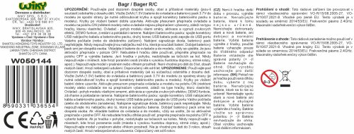 RC bagr na dálkové ovládání. Realistický model se zvukovými efekty a funkčním nabíracím ramenem. Frekvence 2,4 GHz. Ovladač nabízí jízdu vpřed/vzad, otáčení vlevo/vpravo, zvukové efekty s možností vypnutí, tlačítko DEMO, ovládání zvedání a pokládání ramene. Věž bagru je možné otáčet manuálně. Součástí je bateriový pack 3,7 V a USB kabel, ovladač funguje na 2x AA baterie (nejsou součástí). Rozměry bagru: 46 x 13 x 23 cm. Rozměry balení: 48,5 x 26 x 19,3 cm. Nevhodné pro děti do 3 let. Věk: 6+