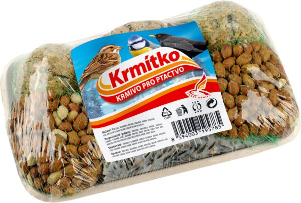 Směs krmiva KRMÍTKO vhodného k zavěšení. Umožňuje ptactvu pohodlnou konzumaci předložené potravy. Skládá se z oříšků, slunečnice, tuků, obilí a vloček. Balení: 7 ks.