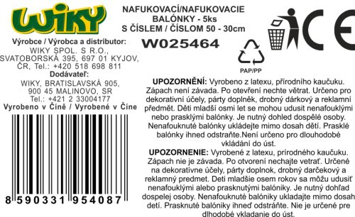 Balónek nafukovací 30 cm - sada 5ks, s číslem 50
