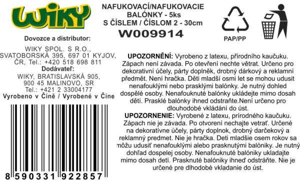 Balónek nafukovací 30cm - sada 5ks, s číslem 2