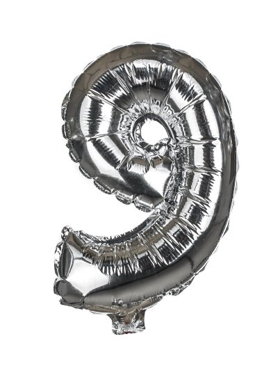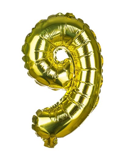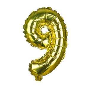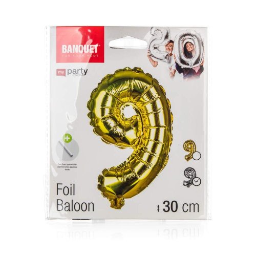 Balónek nafukovací fóliový číslo 9, je vysoký cca 30 cm, barevný mix: zlatá a stříbrná barva. Součástí výrobku je papírové brčko pro nafouknutí balónku a šňůrka pro zavěšení. Výrobek využijete na oslavě, zahradní párty, pikniku apod.