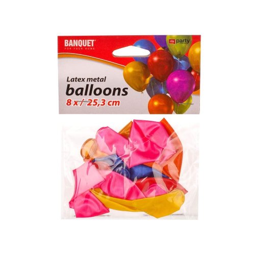 Sada latexových balonků pro Vaše oslavy a party. Sada obsahuje 8 ks kvalitních a zdravotně nezávadných balónků pestrých metalických barev. Pro nafukování lze používat pumpičku, která je součástí sortimentu.