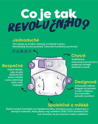 • Revoluční opakovaně použitelné plenky - neobsahují škodlivé materiály a jsou vybaveny nastavitelnými druky, prodyšnými absorpčními tkaninami, voděodolnou vrstvou a nepropustnou konstrukcí.