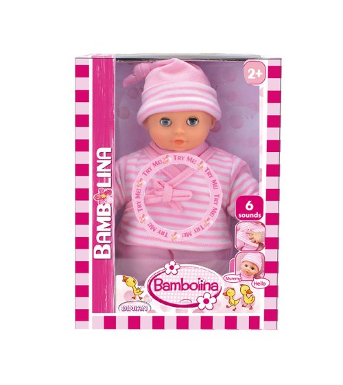 Bambolina je roztomilá panenka o velikosti 20 cm, ideální pro malé děti, které si chtějí hrát na maminku a starat se o svou panenku. Panenka je vybavena 6 zvuky, které ji činí interaktivní a zábavnou. Děti si tak mohou užívat různé situace a scénáře, při kterých panenka vydává zvuky, které ji přivedou k životu. Balení obsahuje assort dvou stylů, takže si můžete vybrat mezi dvěma různými variantami. Bambolina je perfektní společník pro každodenní hru a rozvoj kreativity.