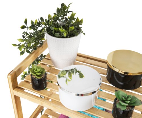 Bambus je překvapivě lehký, takže s celým stojanem s policemi můžete snadno manipulovat. Zároveň je ale dostatečně pevný, takže unese i větší zátěž. Jednou z výborných vlastností bambusového dřeva je navíc jeho velká odolnost vůči vlhkosti a přirozená odolnost vůči bakteriím a plísním, takže se nemusíte obávat jeho umístění v koupelně nebo prádelně.