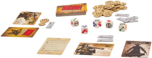 Hra obsahuje: 5 kostek, 30 karet, 9 žetonů šípu, 40 žetonů nábojů, pravidla hry CZ, SK.