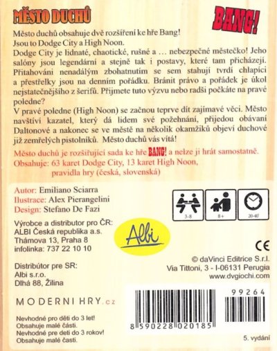 Město duchů je rozšíření ke Hře Bang! Obsahuje dvě rozšíření (v originále vyšla pod názvy Dodge City a High noon) kompletně v českém jazyce. Do hry přichází nové postavy, nové karty a s nimi i nové možnosti.
