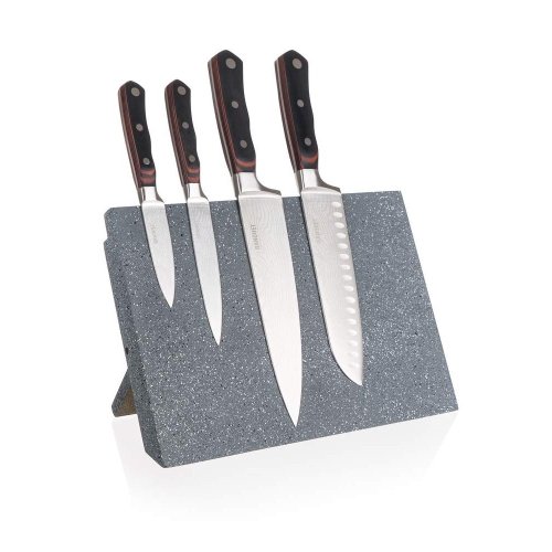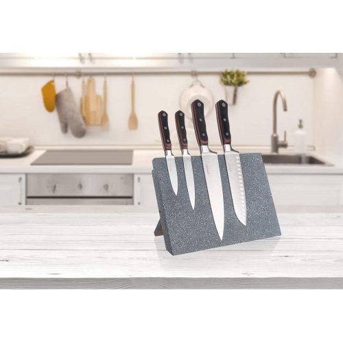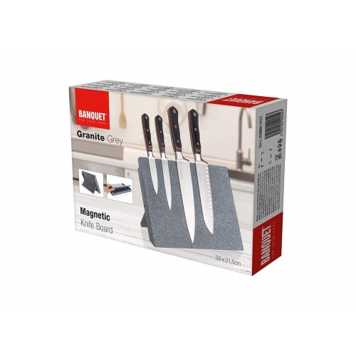 Magnetická deska na nože GRANITE GREY o rozměrech 30 x 21,5 cm je praktický pomocník do každé kuchyně pro přehledné uspořádání nožů. Díky ní budete mít nože neustále po ruce. Povrch desky je z MDF v šedé barvě s dekorem Granite Grey. Magnetická deska slouží jako stojánek a umožní vám bezpečný a snadný přístup k nožům. Pevné uchycení nožů zajišťuje silný magnet uvnitř desky.