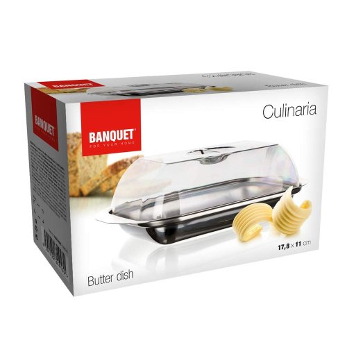 Dóza na máslo CULINARIA, rozměry dózy: délka 17,8 cm, šířka 11 cm, výška 5,5 cm, materiál - nerez 430 (18 / 0, síla 0,50 mm), plastové transparentní víčko.