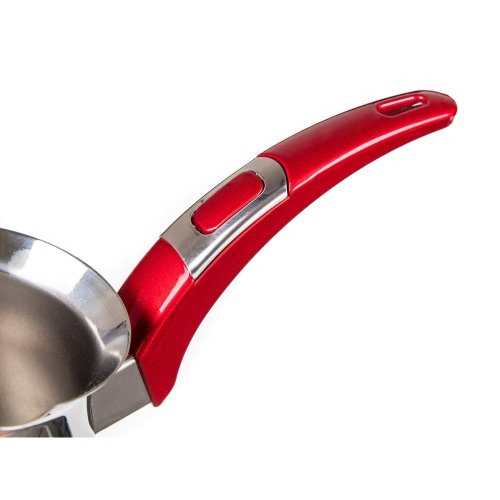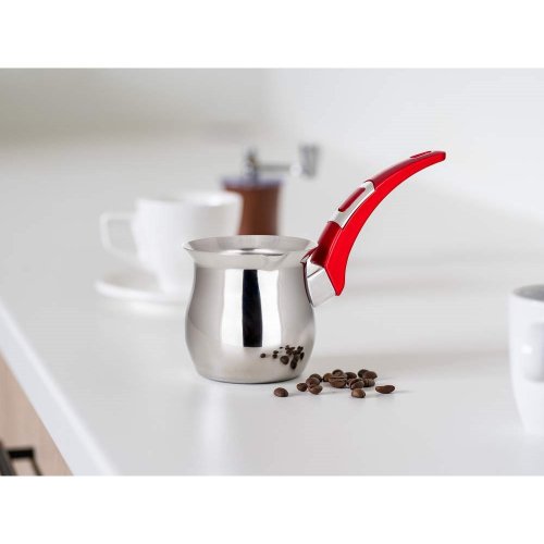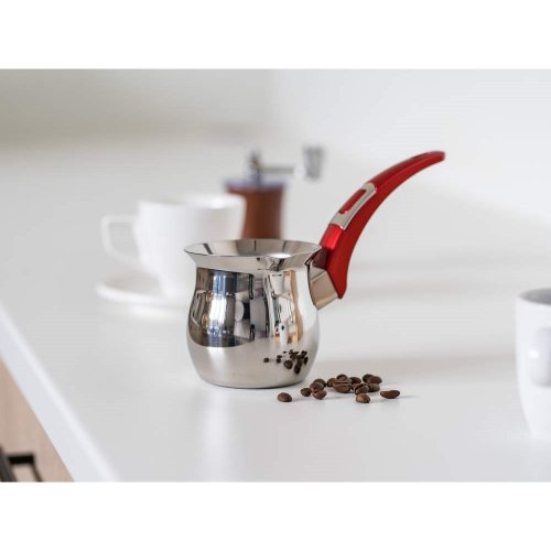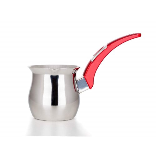 Nerezová džezva VISTA RED se zaoblenou rukojetí o objemu 350 ml, jvyrobená z nerezové oceli 18/10, tloušťka stěny 0,70 mm, díky kvalitní nerezové oceli udrží kávu či jiné nápoje delší dobu teplé. Vhodná pro všechny typy sporáků.