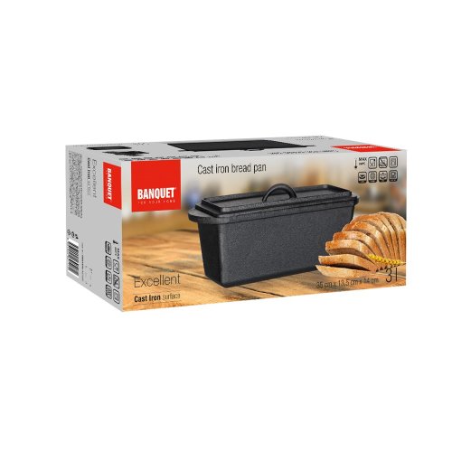 Forma litinová na chleba EXCELLENT hranatá s víkem, o objemu 3 l a rozměru 35 x 13,5 x 14 cm v černé barvě. Litinový pekáč je ideální nejen pro pečení chleba. Litina zajistí rovnoměrné propečení čímž dodá chlebu nezaměnitelnou zlatou křupavou kůrku. Masivní materiál, který jakmile se nahřeje, vydrží dlouho a rovnoměrně rozvádí teplo, díky němuž se pokrm v litinovém pekáči upeče rovnoměrně, za kratší dobu a úsporněji. Před prvním použitím naneste na povrch pekáče rostlinný olej a postupně jej začněte ohřívat v troubě (začněte na mírném ohni a pomalu zvyšujte teplotu). Zapečením oleje získá výrobek svoji nepřilnavost. Litinová forma je ideálním pomocníkem ve vaší kuchyni. Můžete v ní péct jakékoliv pečivo, buchty, pizzu, ale i zapékat brambory, zeleninu apod.