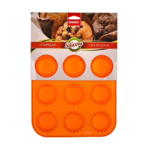 Silikonová forma na 12 ks košíčků CULINARIA Orange, rozměry formy: 32 x 24 x 3,4 cm. Forma je odolná vysokým teplotám (do 230 st.C), neváže chutě ani pachy pokrmů, snadno se udržuje (lze mýt v myčce na nádobí). Silikon je velmi populární materiál, který pro své jedinečné vlastnosti našel své uplatnění i v kuchyni. Vyrábí se z něj různé druhy forem na pečení, vály a válečky na těsto, stěrky, mašlovačky, různé druhy kuchyňské náčiní a mnohé další výrobky.