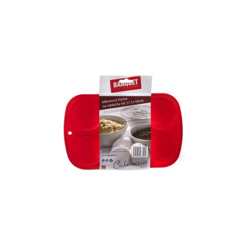 Silikonová forma na muffiny 6 ks Red CULINARIA, rozměry: 27,5 x 18 x 3,2 cm. Forma je odolná vysokým teplotám do 240 st.C, lze jí používat do elektrické i mikrovlnné trouby, neváže chutě ani pachy pokrmů, snadno se udržuje, lze mýt v myčce na nádobí. Silikon je velmi populární materiál, který pro své jedinečné vlastnosti našel uplatnění i v kuchyni. Vyrábí se z něj různé druhy forem na pečení, vály a válečky na těsto, stěrky, mašlovačky, kuchyňské náčiní a mnohé další výrobky.