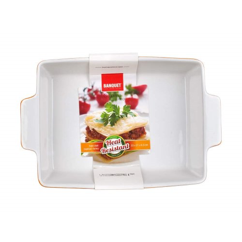 Keramická obdélníková zapékací forma 33 x 21 cm CULINARIA Orange s praktickými držadly pro snadnou manipulaci, výška formy 6,5 cm, bílá a oranžová glazura, vnější strana formy má vlnkový reliéf. Keramické formy rovnoměrně absorbují teplo a postupně ho uvolňují, díky čemuž se pokrmy dobře propečou.
