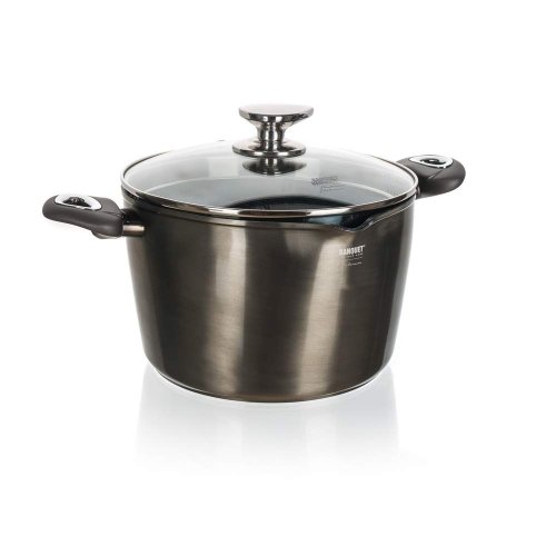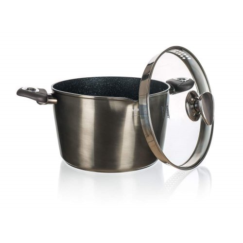 Hliníkový litý kovaný hrnec s výlevkou a se skleněnou poklicí METALLIC PLATINUM s nepřílnavým povrchem o rozměru 24 x 15,5 cm, vnější karbon metalický nástřik, tloušťka stěny 3 mm, plně indukční dno, soft-touch rukojeť a nerezový knob. Nepřilnavý povrch je velmi tvrdý a odolný proti poškrábání. Hrnec je odolný proti nárazu.