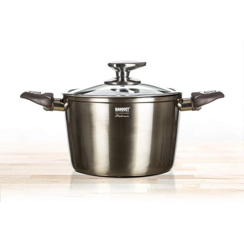 Hliníkový litý kovaný hrnec se skleněnou poklicí METALLIC PLATINUM s nepřílnavým povrchem, 20 x 13,5 cm, vnější karbon metalický nástřik, tloušťka stěny 3 mm, plně indukční dno, soft-touch rukojeť a nerezový knob. Nepřilnavý povrch je velmi tvrdý a odolný proti poškrábání. Hrnec je odolný proti nárazu.