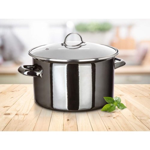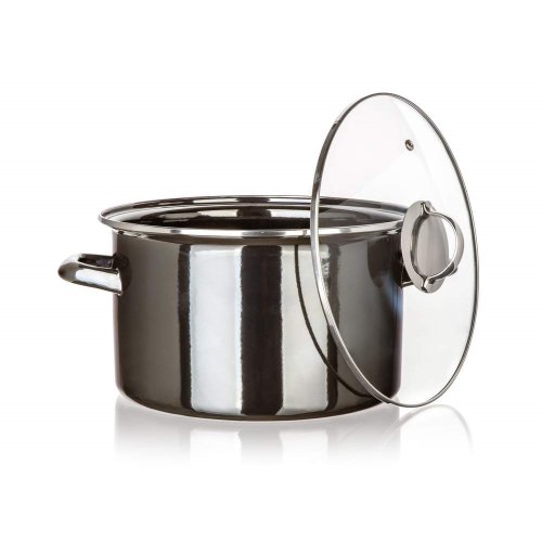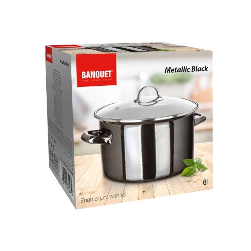 Smaltovaný hrnec METALLIC Black 6 l, se skleněnou poklicí. Rozměry: průměr 26 cm, výška (bez poklice) 15 cm. Barevné provedení černá metalíza. Hrnec lze používat na všechny typy varných desek včetně indukce.