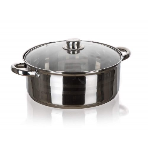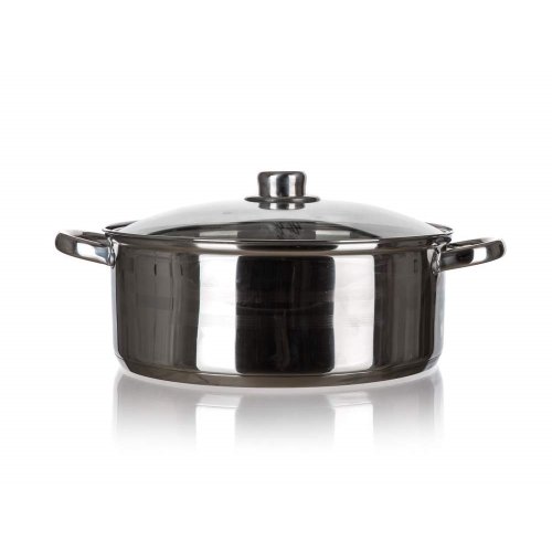 Nerezový kastrol LIVING 6,6 l pro přípravu různých pokrmů jako je polévka, omáčka atd. Má skleněnou poklici, nerezový knob i držadla, lesklý povrch uvnitř i vně a na vnější straně jsou tři matné pruhy. Kastrol lze použít na všechny typy varných desek včetně indukce a je vhodný do myčky na nádobí. Materiál: nerez 201, rozměry: výška kastrolu 11 cm a průměr 28 cm.