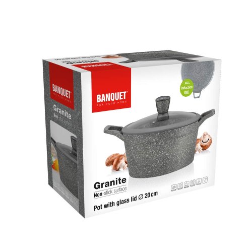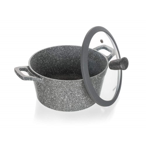 Litý kastrol GRANITE o průměru 20 cm je opatřen vnitřním nepřilnavým povrchem, který zabraňuje připalování jídel při vaření. Kastrol je vybaven skleněnou poklicí s knobem se silikonovým povrchem, který zajišťuje ochranu proti popálení při vaření i manipulaci s poklicí. Dno kastrolu je ošetřeno žáruvzdorným granitovým nástřikem. Kastrol je dodáván v šedé barvě s granitovým dekorem.