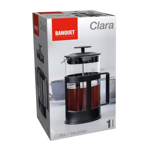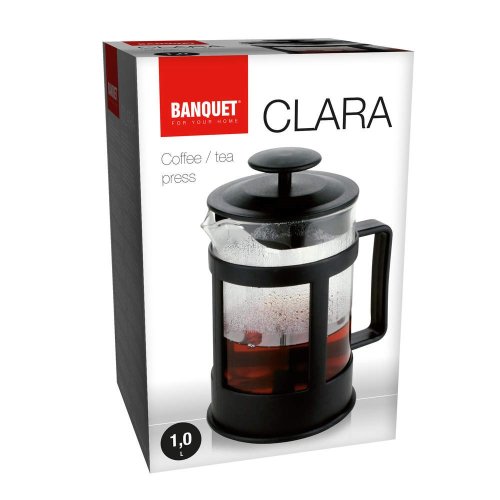 Konvice na kávu CLARA 1 l je skleněná konvice s plastovými doplňky v černé barvě a filtračním pístem z nerezové oceli, nerez 18/8, sklo je určeno pro horké nápoje (sklo není varné).