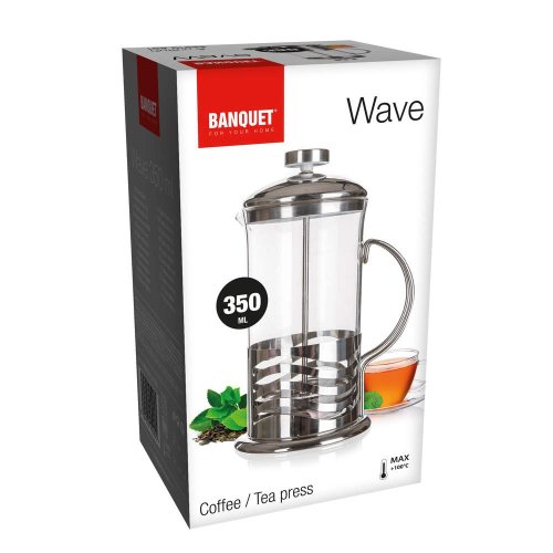 Skleněná konvice na kávu WAVE 350 ml s nerezovými doplňky je vybavena filtračním pístem z nerezové oceli (nerez 18/8), jehož stlačením je dosaženo dokonalého oddělení kávové sedliny. Sklo konvice je určeno na horké nápoje do 100 st. C.