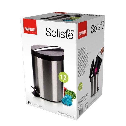 Odpadkový koš SOLISTE 12 l, nerezové provedení, matný povrch, plastové víko a vnitřní vyjímatelná nádoba na odpad. Koš má nášlapný systém na otevírání víka pro hygienickou manipulaci.