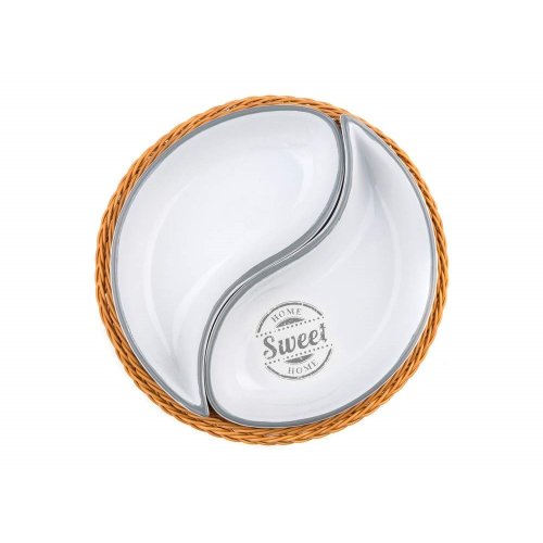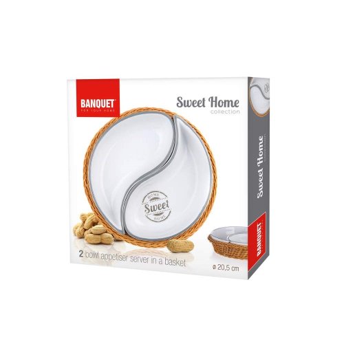 Mísa v košíku SWEET HOME o průměru 20,5 cm v proutěném PVC košíku 20,5 cm, je vhodná na podávání slaných i sladkých pochutin. Sada obsahuje: 2 x misku a 1 x proutěný PVC košík. Jedná se o oblíbenou kolekci keramiky s dekorem SWEET HOME, kterou můžete doplnit o další položky z této dekorované řady.