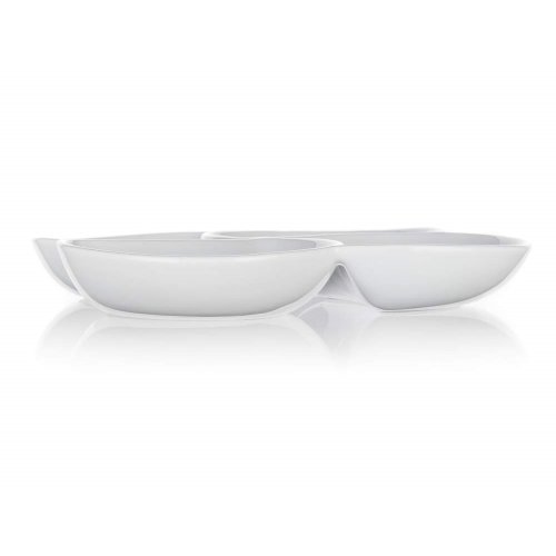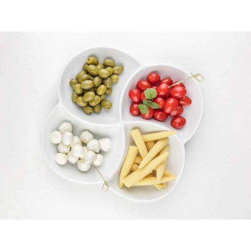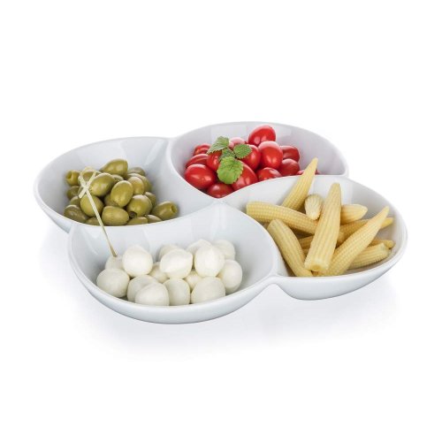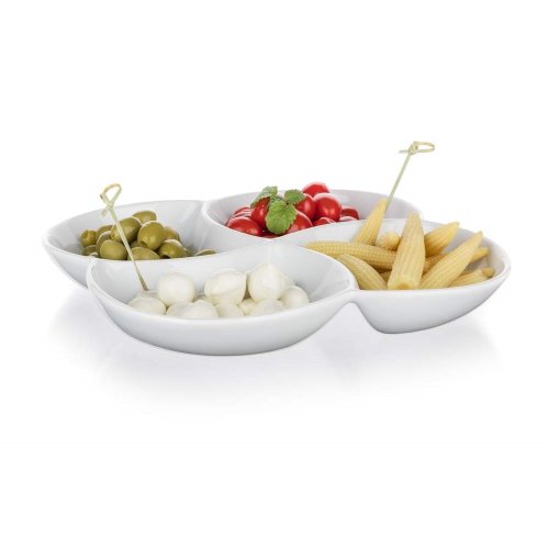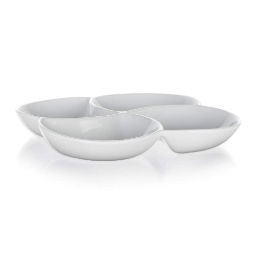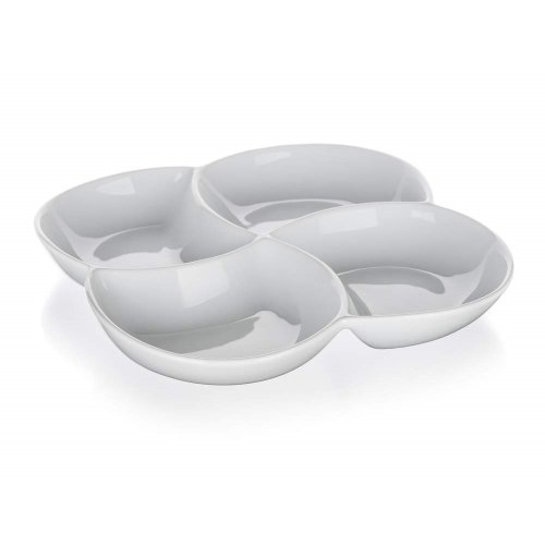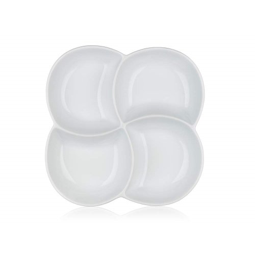 Servírovací porcelánová miska BIANCA dělená, v bílé barvě, ve tvaru čtyřlístku o rozměrech 26,5 x 26,5 cm a výšce 4,2 cm je vhodná pro servírování různých dipů, oříšků, chipsů, ovoce či zeleniny. Vhodné pro každodenní použití. Mísa je vhodná do myčky na nádobí.