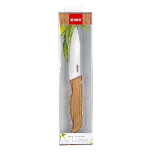 Nůž praktický keramický ACURA BAMBOO 20 cm, keramická čepel (oxid zirkoničitý) délky 10 cm, síla ostří 1,6 mm, bambusová rukojeť. Ostří keramického nože je vyrobeno z keramického materiálu zvaného oxid zirkoničitý. Tato sloučenina vyniká vysokou pevností a odolností. Ergonomická rukojeť z TPR s protiskluzovou úpravou. Nůž je velmi odolný proti skvrnám a snadno se čistí. Čepel do sebe nepropustí žádnou z kyselin obsažených v potravinách. Vitamíny se díky keramické čepeli z potravin neztrácejí. Maso, zelenina či ovoce se nelepí na nůž. Nůž má nízkou hmotnost a vyvážené těžiště, snadno se s ním manipuluje při práci. Keramické nože jsou tvrdší než kovové, proto nepotřebují každodenní přebrušování ocílkou jako ocelové. Daní za vysokou tvrdost je jejich křehkost, proto se nedoporučuje sekat s nimi např.kosti, lámat nůž při krájení a vyvarovat se pádu nože na zem.