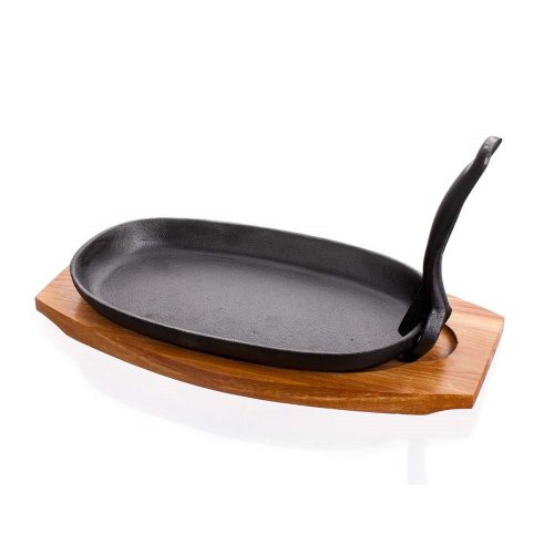 Litinová pánev 23 x 14 cm na dřevěném prkénku, odnímatelné litinové držadlo na vyndávání pánve z trouby. Pánev je vhodná pro zapékání pokrmů, lze jí použít pro přímé servírování, dřevěné prkénko slouží jako podložka pod horkou pánev. Pánev lze použít pro přímé servírování, dřevěné prkénko slouží jako podložka pod horkou pánev.