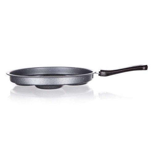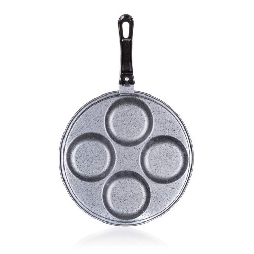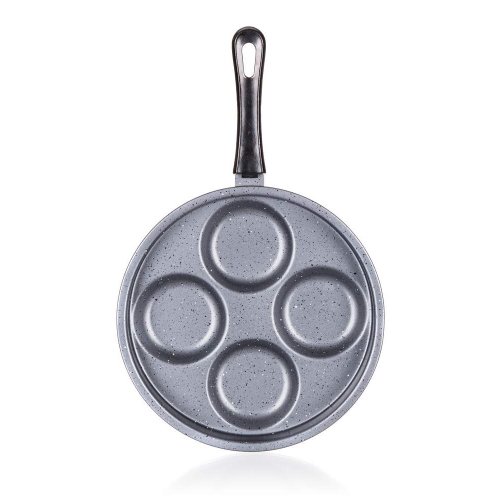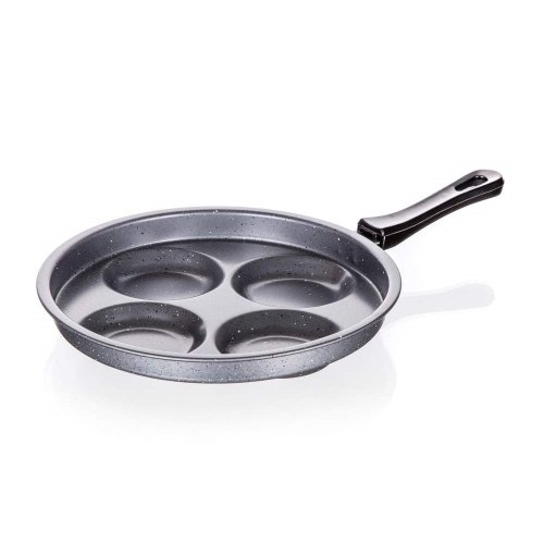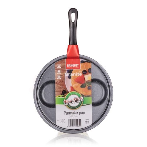 Pánev na 4 lívance GRANITE Grey o průměru 24 cm, vyrobená z uhlíkové oceli s nepřilnavým povrchem, síla materiálu 0,7 mm, plastová rukojeť s otvorem pro možnost zavěšení.