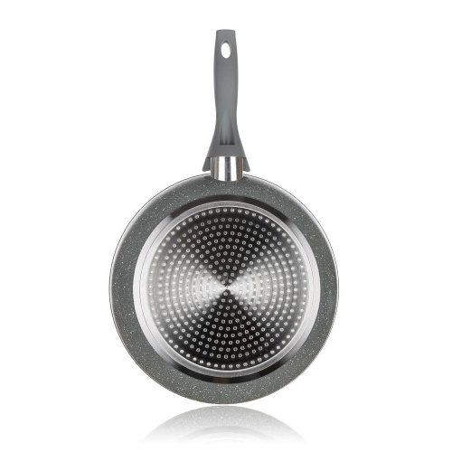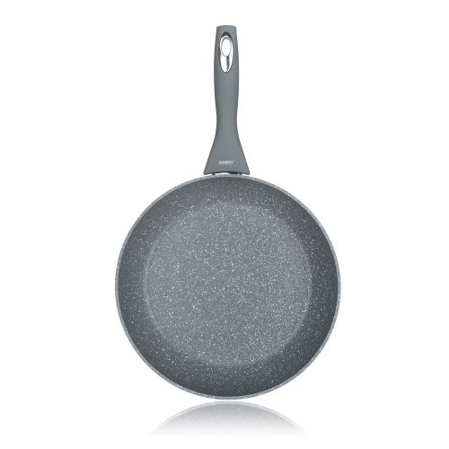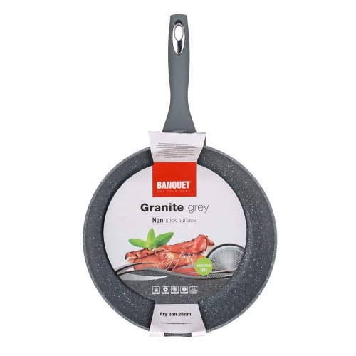 Hliníková litá kovaná pánev GRANITE GREY 28 x 5,3 cm s nepřílnavým povrchem, šedý granitový dekor, tloušťka stěny 3 mm, soft-touch rukojeť. Nepřilnavý povrch je velmi tvrdý a odolný proti poškrábání. Vysoká tepelná vodivost zajišťuje rychlé a ekonomické vaření - dlouho drží teplotu. Pánev je odolná proti nárazu a deformaci tvaru. Je vhodná na všechny typy varných desek včetně indukce.