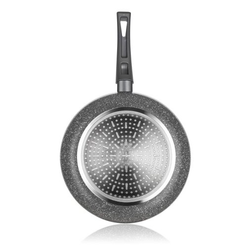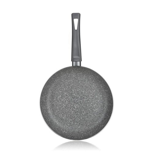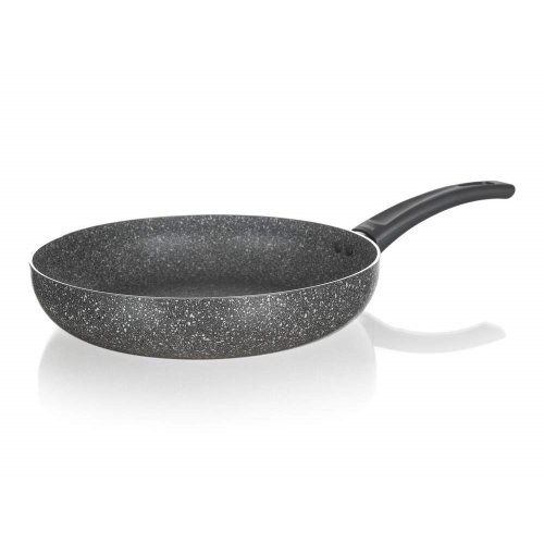 Hliníková presovaná pánev GRANITE 28 x 5,8 cm s nepřilnavým 2vrstvým povrchem v granitovém dekoru a šedou bakelitovou rukojetí se soft-touch povrchovou úpravou. Pánev je vhodná na všechny typy varných desek včetně indukce.