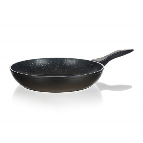 Kovaná hliníková pánev LUMIA 24 x 4,8 cm s 3vrstvým vnitřním nepřílnavým povrchem, vnější část v černém matném provedení s žáruvzdorným nástřikem. Pánev se vyznačuje novým technologickým prvkem, ochranný prstenec nad rukojetí se postupně se zvyšující teplotou mění z černé na sytě červenou barvu. Změna začíná při 40 st.C a postupně dochází k sycení červené barvy až do 70 st.C, kdy je pánev připravena k plnému vaření. Součástí balení je proložka na pánve v červené barvě.