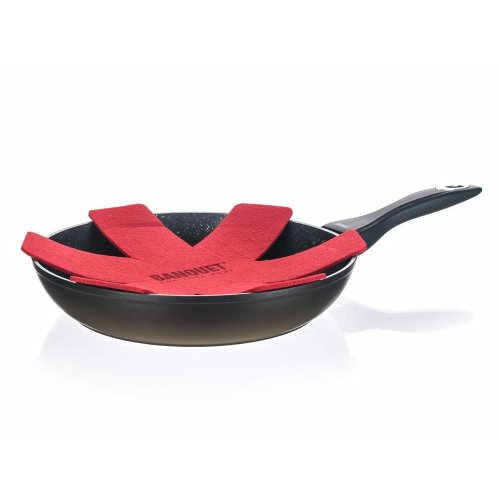 Kovaná hliníková pánev LUMIA 26 x 5 cm s 3vrstvým vnitřním nepřílnavým povrchem, vnější část v černém matném provedení s žáruvzdorným nástřikem. Pánev se vyznačuje novým technologickým prvkem, ochranný prstenec nad rukojetí se postupně se zvyšující teplotou mění z černé na sytě červenou barvu. Změna začíná při 40 st.C a postupně dochází k sycení červené barvy až do 70 st.C, kdy je pánev připravena k plnému vaření. Součástí balení je proložka na pánve v červené barvě.