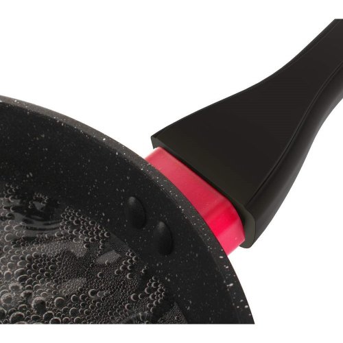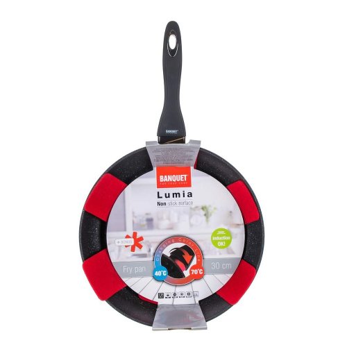 Kovaná hliníková pánev LUMIA 30 x 5,6 cm s 3vrstvým vnitřním nepřílnavým povrchem, vnější část v černém matném provedení s žáruvzdorným nástřikem. Pánev se vyznačuje novým technologickým prvkem, ochranný prstenec nad rukojetí se postupně se zvyšující teplotou mění z černé na sytě červenou barvu. Změna začíná při 40 st.C a postupně dochází k sycení červené barvy až do 70 st.C, kdy je pánev připravena k plnému vaření. Součástí balení je proložka na pánve v červené barvě.