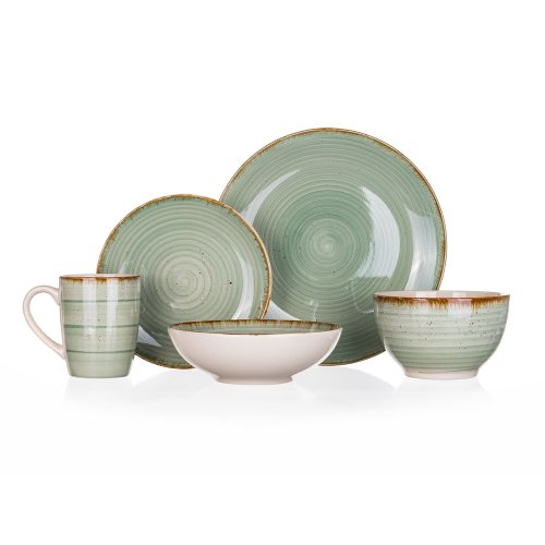 30dílná jídelní sada SPIRAL Green se hodí pro každé stolování. Sada obsahuje: 6 x hluboký talíř 18 cm, 750 ml, 6 x mělký talíř 27 cm, 6 x dezertní talíř 19,5 cm, 6 x misku 14,5 cm, 880 ml a 6 x hrnek 360 ml, materiál: keramika. Nádobí lze používat do mikrovlnné trouby a mýt v myčce na nádobí.