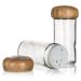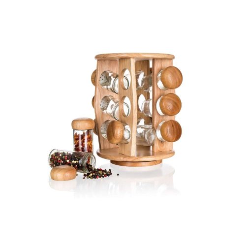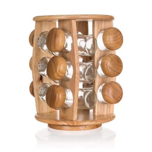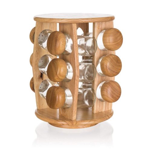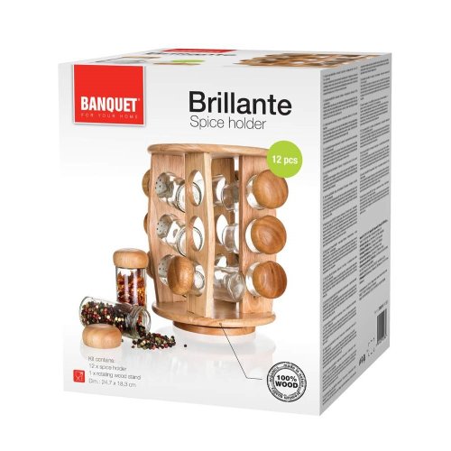 12dílná sada kořenek Brillante obsahuje: 12x kořenka skleněná s dřevěnými víčky z gumovníkového dřeva, 1x otočný dřevěný podstavec 19,8 x 19,8 x 24,1 cm. Podstavec je vyrobený z gumovníkové dřeva. Gumovník je prvotřídní přírodní ušlechtilé tvrdé dřevo, které nepohlcuje pachy a nevsakuje tekutiny. Nemá tendenci vlnit se a praskat. Je jedním z nejvíce ekologicky nezávadných druhů dřeva.