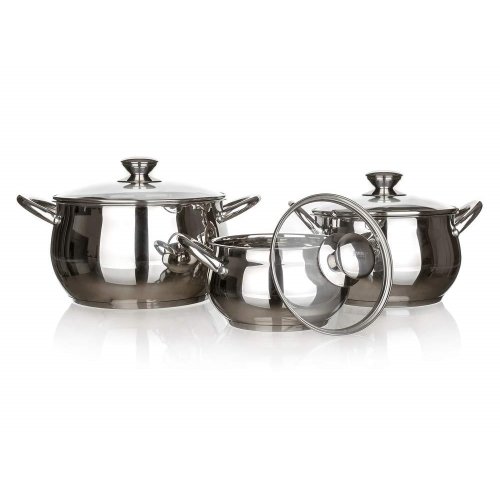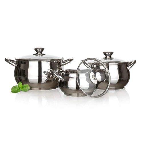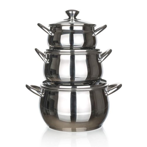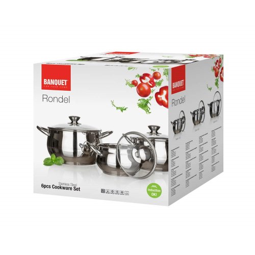 Sada nerezového nádobí RONDEL 6 ks obsahuje: hrnec 16 x 10,5 cm s poklicí, hrnec 20 x 12,5 cm s poklicí, hrnec 24 x 14 cm s poklicí. Nádobí lze používat na všechny typy sporáků. Poklice jsou vyrobeny z odolného skla a mají otvor na páru pro dokonalou kontrolu nad vařením. Povrchová uprava nerezi lesk (uvnitř i vně). Nádobí se snadno udržuje, lze mýt v myčce. Držadla jsou k hrncům našroubovaná.