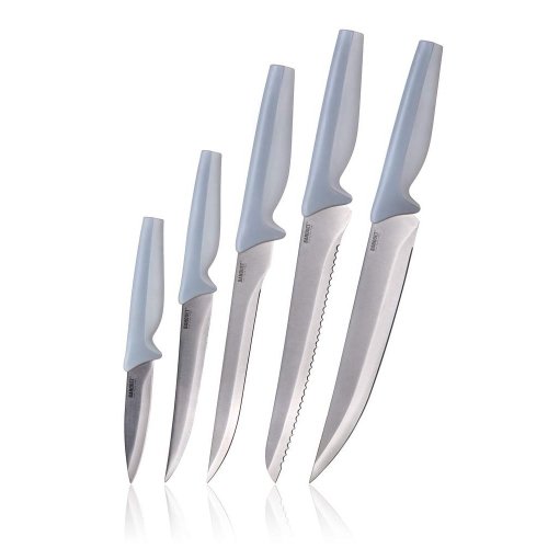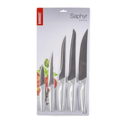 5 dílná sada SAPHYR obsahuje praktický nůž 18,5 a 23,5 cm, porcovací nůž 32 cm, vykošťovací nůž 30 cm a nůž na chléb 32 cm. Ocelové nože patří mezi nepostradatelné pomocníky v každé kuchyni. Výběr vhodného nože nám usnadní krájení či porcování potravin.