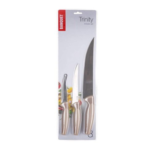 3 dílná sada TRINITY obsahuje praktický nůž 18,5 a 23,5 cm a porcovací nůž 32 cm. Ocelové nože patří mezi nepostradatelné pomocníky v každé kuchyni. Výběr vhodného nože nám usnadní krájení či porcování potravin.