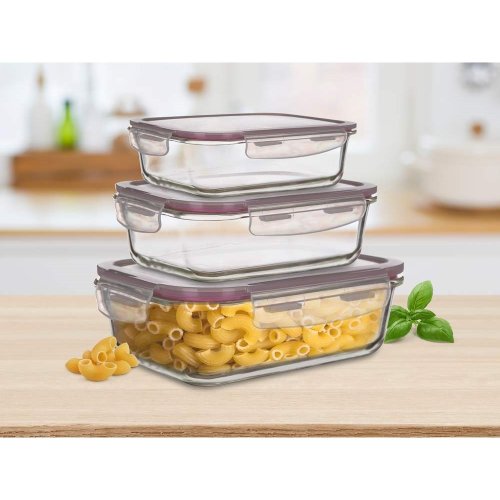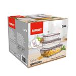 Sada dóz LORA 550 ml, 950ml a 1450ml jsou hermeticky uzavíratelné skleněné nádoby, které jsou vhodné pro uchovávání potravin v čerstvém stavu, zmrazování a ohřívání. Dokonale se hodí do pečící trouby (bez víčka) i mikrovlnné trouby. Díky speciálnímu víku je dóza ideální pro přepravu potravin. V nabídce máme několik velikostí.
